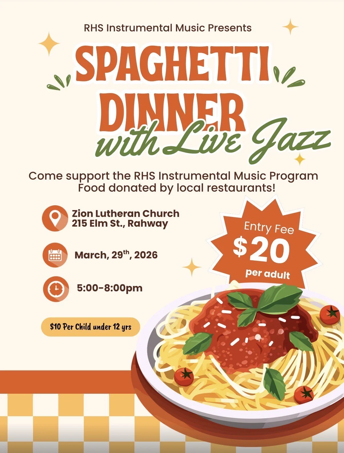 On Sunday, March 29, 2026 from 5-8pm Zion will host a fundraiser dinner for the RHS Music Program. Food will be donated by the local restaurant Michelino’s. The High School will bring a 17 piece jazz band to entertain attendees. It is $20 for admission.